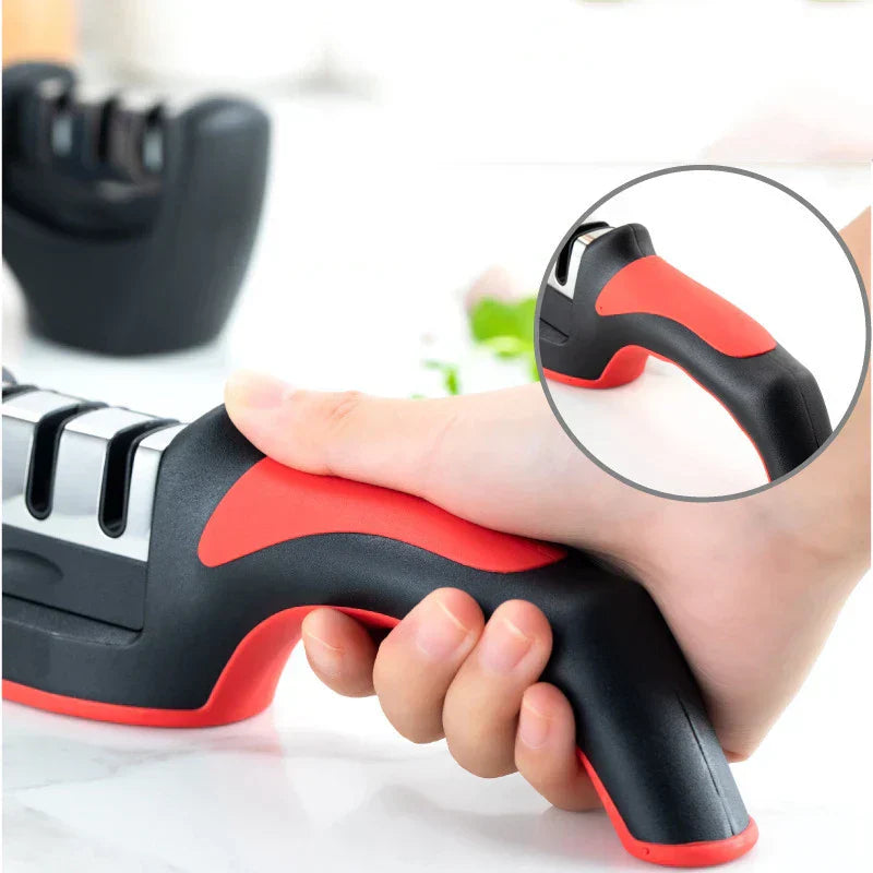 O Amolador de Facas Profissional 3 Afiações ajudará muito no seu dia a dia na cozinha. Você não precisa mais passar trabalho com aquelas facas sem fio. Basta utilizar esse incrível afiador de 3 níveis e suas facas serão como novas. Os níveis possibilitam afinar mais o fio da sua faca. É simples e prático.